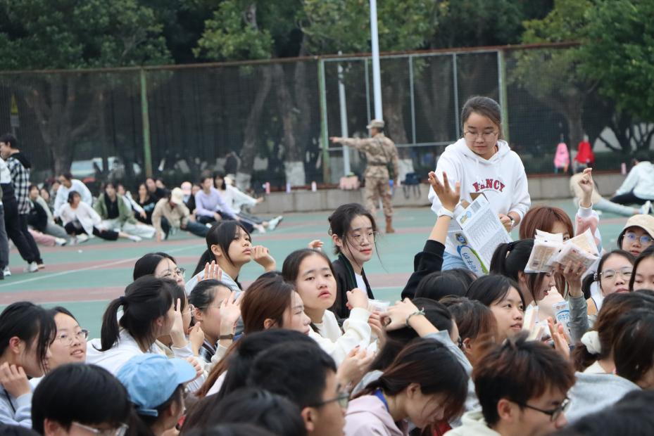 最后,来慰问的学院师生向每位受训学生发放慰问品,鼓励同学们勇于挑战自我、超越自我,圆满完成军训任务。