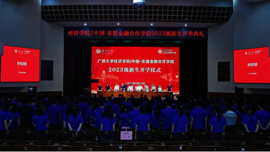 /中国-东盟金融合作学院2023级新生开学仪式在全场师生齐唱广西大学校歌中圆满结束。