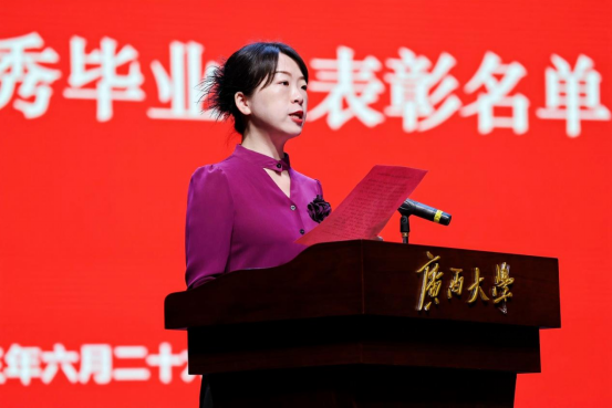 陈卉娟副书记宣读获得自治区和广西大学“优秀毕业生”荣誉称号的毕业生名单