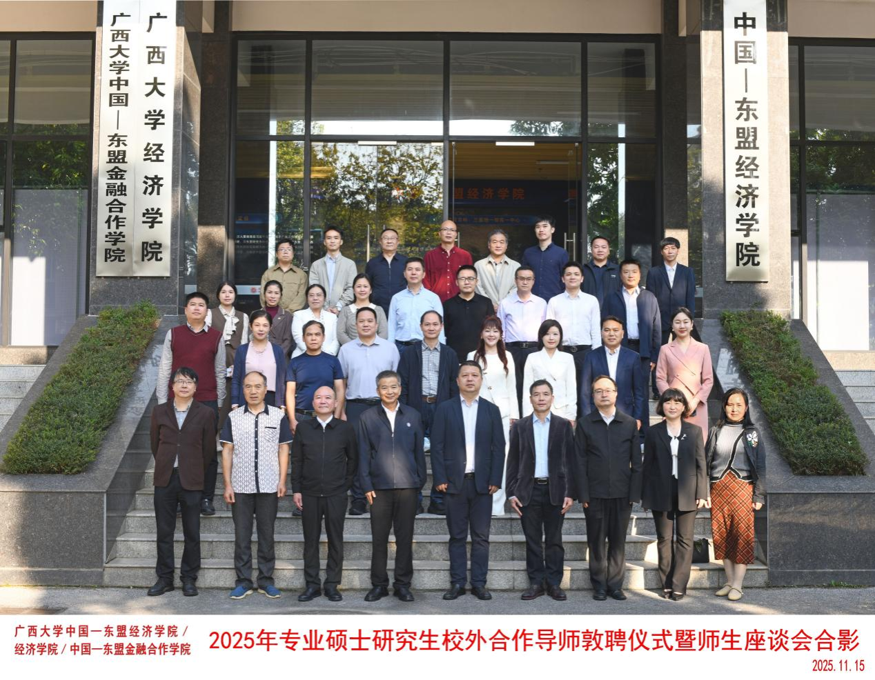 To further deepen industry-education integration and strengthen the collaborative talent cultivation mechanism between schools and enterprises, China-ASEAN School of Economics held a grand ceremony on the afternoon of November 15, 2025, to appoint off-campus cooperative mentors for master students and hold a faculty-student symposium. This initiative aims to fully leverage the practical guidance role of external mentors in master's training, precisely align with industry demands, and enhance talent cultivation quality. The event gathered Executive Deputy Secretary Jiang Wei, heads of master's mentor groups, appointed off-campus mentors, and representatives of in-house mentors to witness this significant milestone. The ceremony was presided over by Professor Tan Chunzhi, Vice Dean of the school.