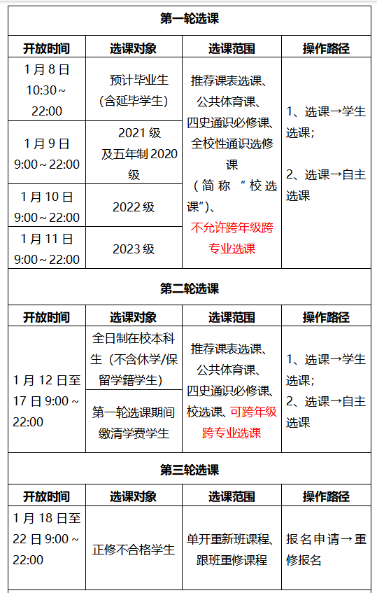 2023-2024学年第二学期网上选课定于2024年1月8日10:30分开始,本次选课按照分年级分轮次的原则进行,请各学院高度重视选课工作,指定专业负责人集中指导学生合理选课,帮助学生了解本专业学分制修业要求。本次选课工作具体通知如下: