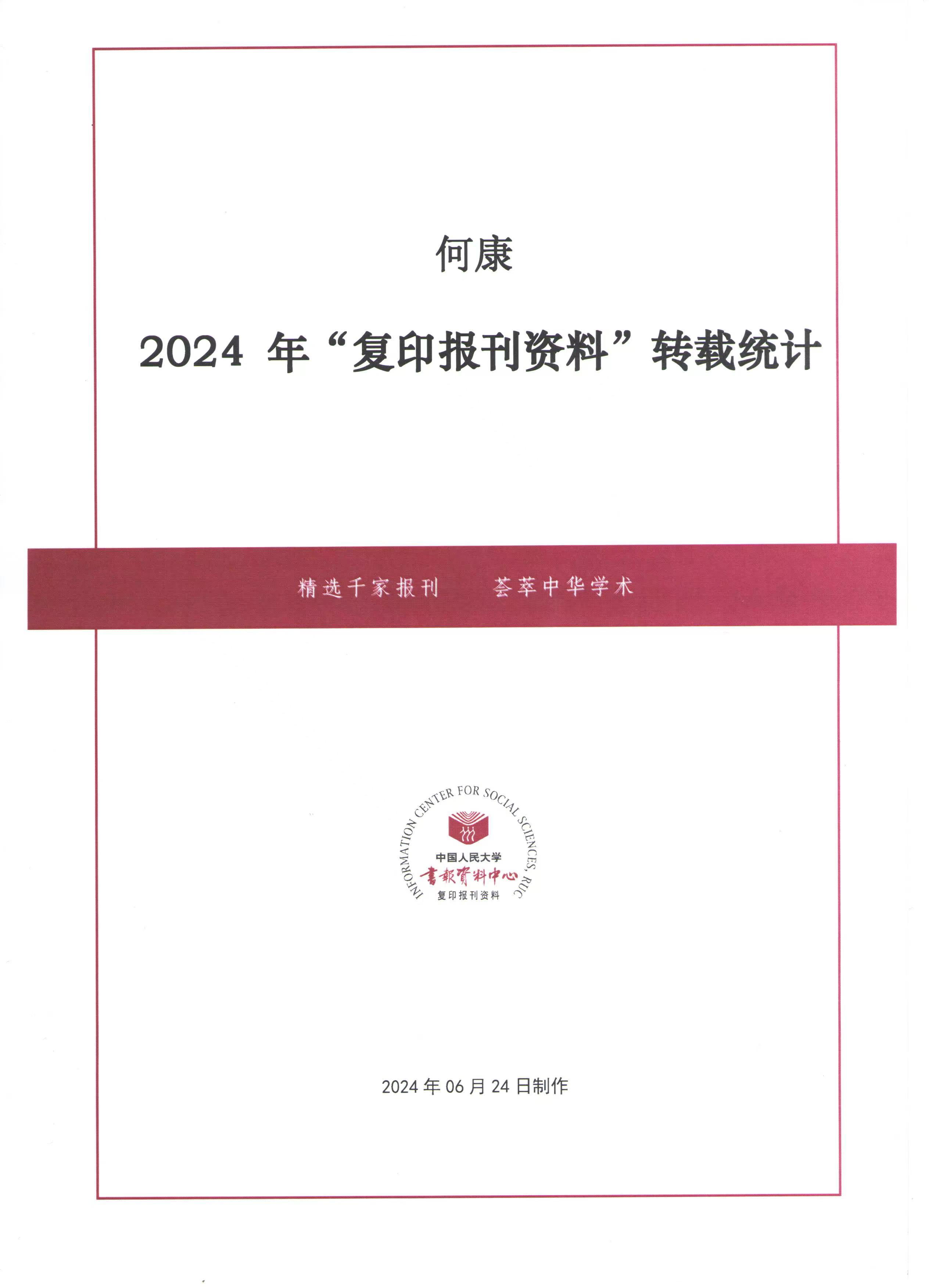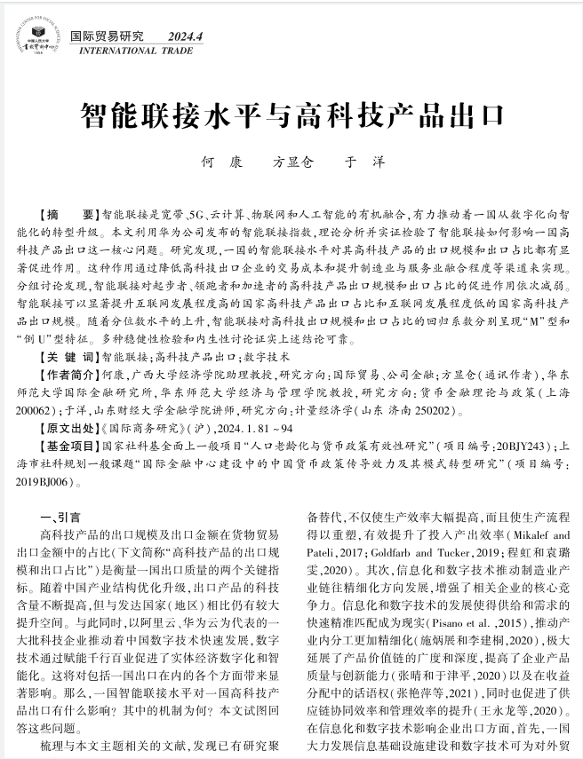 何康助理教授及其合作者撰写的论文“智能联接水平与高科技产品出口”被中国人民大学书报资料中心复印报刊资料《国际贸易研究》2024年第4期全文转载。该文曾发表在《国际商务研究》2024年第1期。
