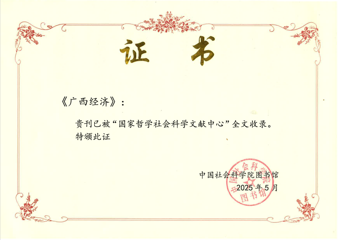 近日,《广西经济》成为“国家哲学社会科学文献中心(CASS)”收录期刊,文献数据被“国家哲学社会科学学术期刊数据库”全文收录。目前,我国正式出版的人文社科类中文期刊共计5000多种,其中,被国家哲学社会科学文献中心收录的中文期刊仅2600多种。这是《广西经济》2024年全面改版以来,学术质量和影响力快速发展提升的重要体现,也标志着办刊质量、期刊影响力得到了国家级学术期刊平台的认可。