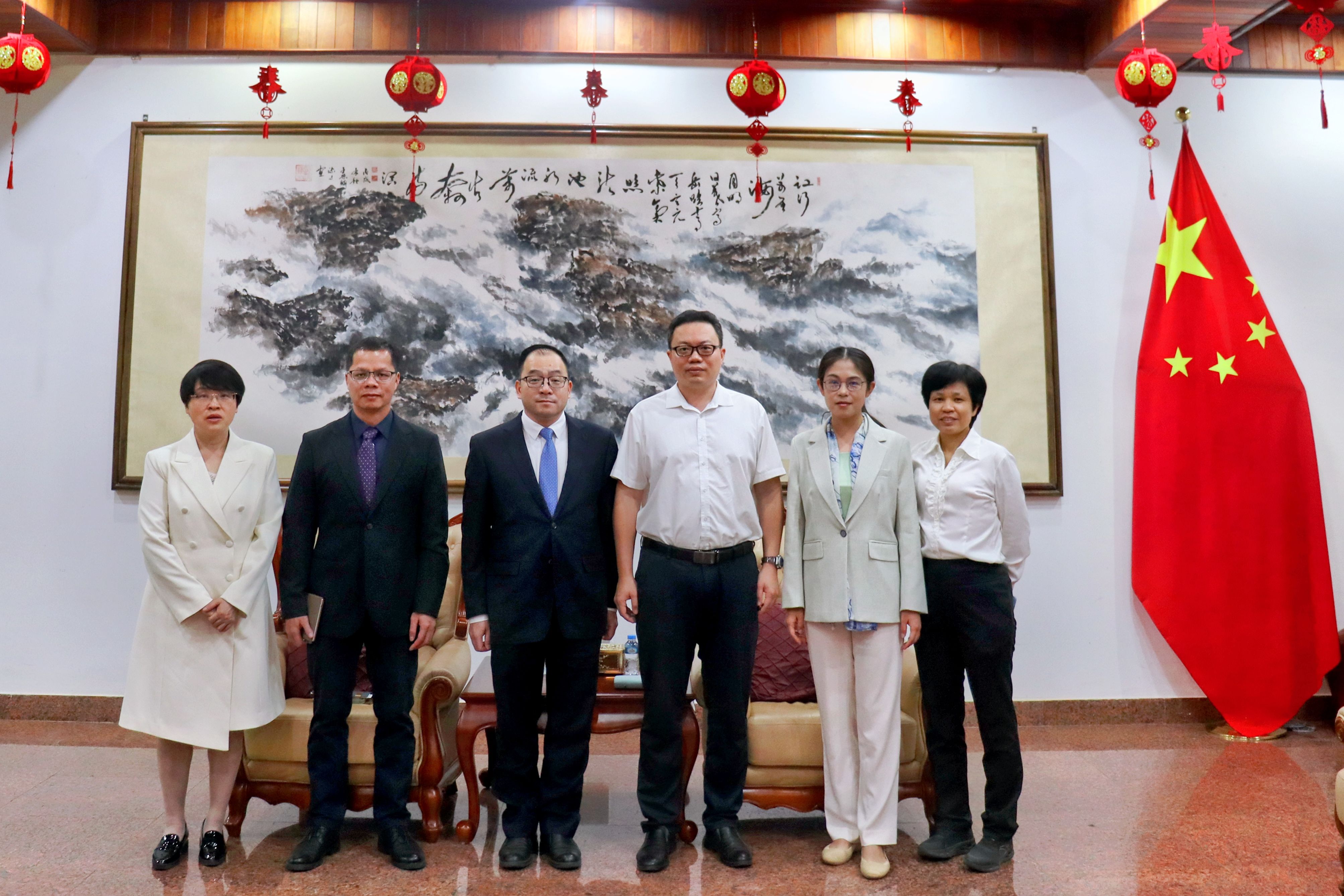 4月9日上午,代表团拜访中国驻老挝大使馆,汇报了学院面向东盟的战略发展定位和建设进展、主要研究方向和培养老挝留学生等情况。中国驻老挝大使馆经商处一等秘书韩烨处长会见了代表团,介绍了老挝的宏观经济形势、资源开发利用及中老铁路运营等情况,并表示将进一步支持学院与老挝学界的国际交流与合作,助力培养具有国际视野的东盟专业人才,共同服务中国—东盟命运共同体建设。