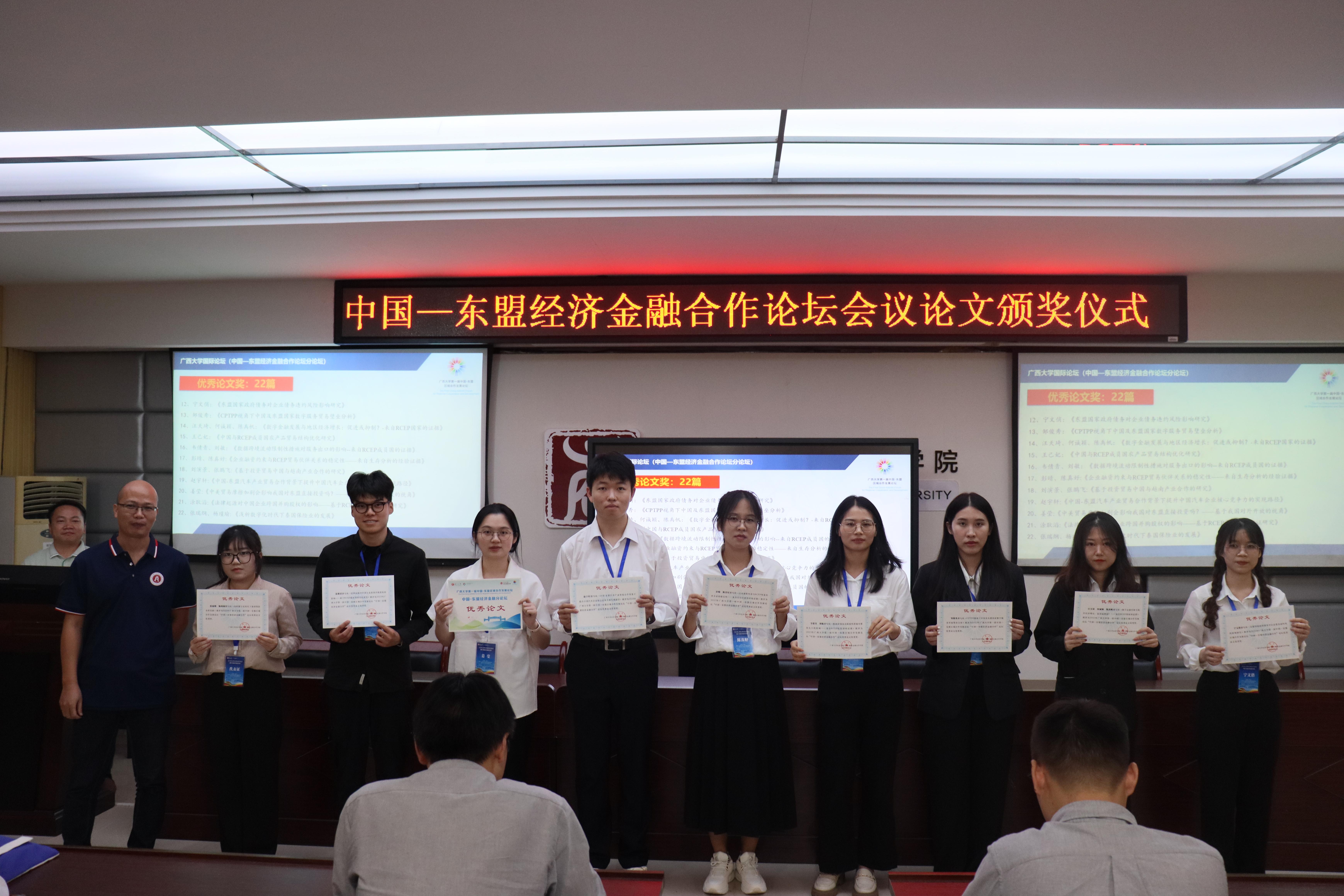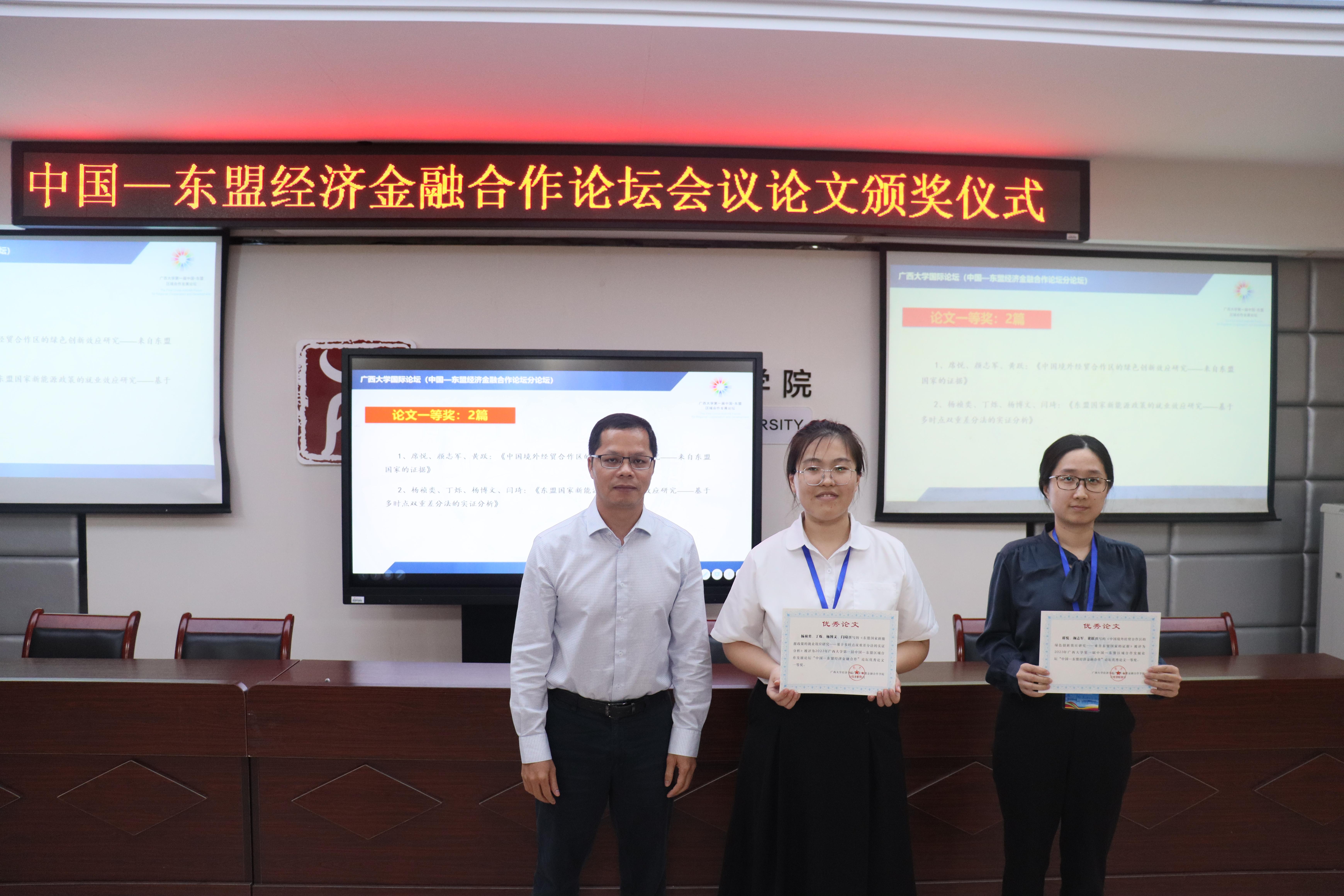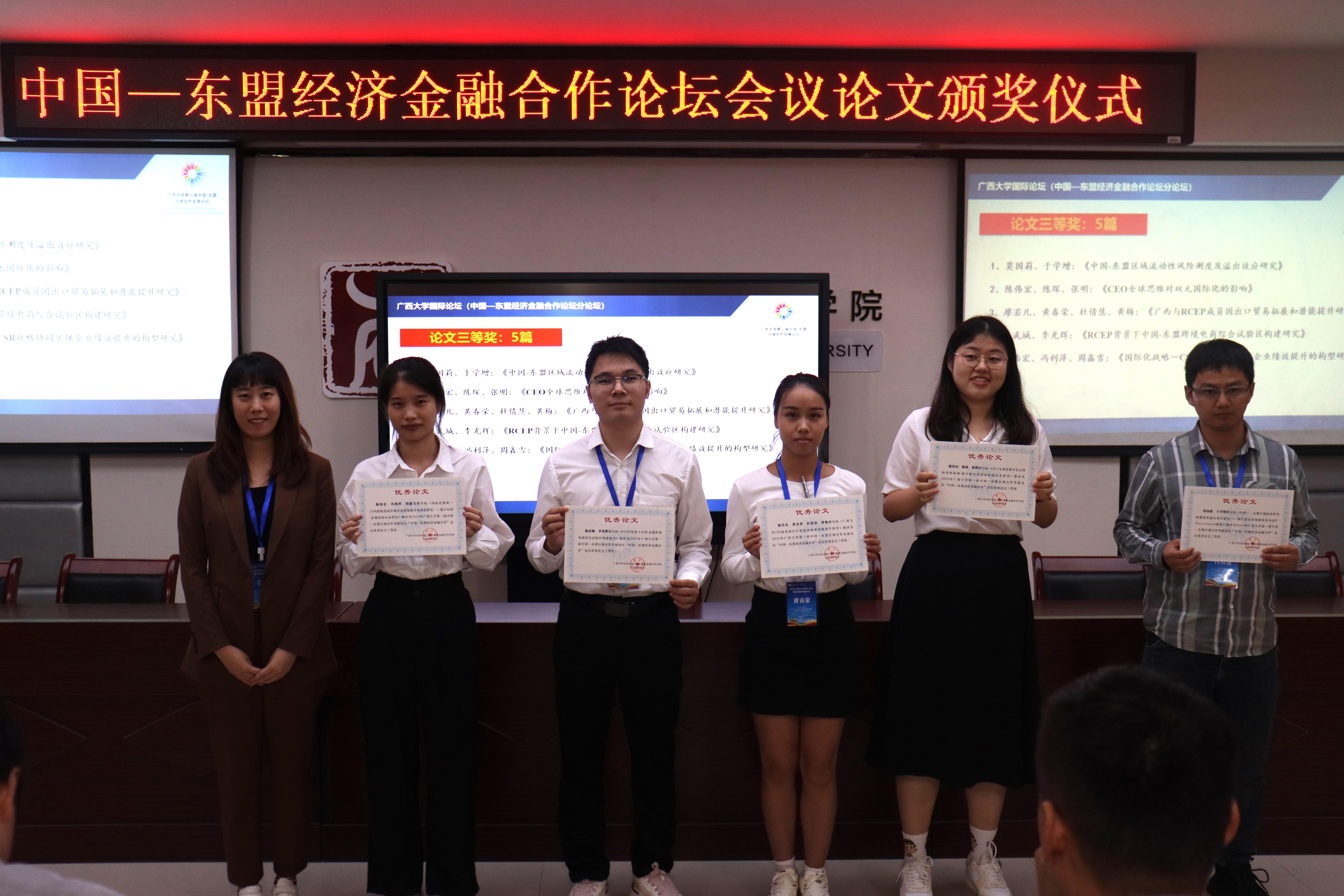 本次论坛的征文得到了来自区内外高校师生的积极响应。15日下午,论坛举办“自贸区与服务贸易”“国际贸易与投资”“金融发展与合作”三个学术平行论坛,从会议投稿中选取了《东盟国家新能源政策的就业效应研究》等34篇优秀论文,进行宣读和专家点评。最后,在MBA大楼124报告厅举行了隆重的优秀论文颁奖仪式,由金融财政支部书记陈新建主持,学院副院长梁权熙,院长助理刘骞文、毛薇及金融系主任谢军为获奖论文作者颁奖。