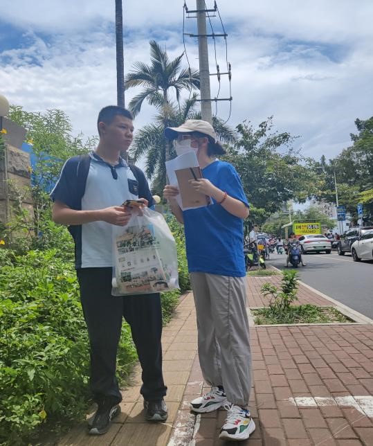 2022年7月8日至10日,六名本科生在上午十点钟到达广西大学附属中学的学校门口等待中学生们的放学,十一点三十分学生们从校门走出来,我们六名本科生随机采访了几位中学生和学生家长,询问他们是否了解国家助学政策,并且向他们宣传讲解了国家教育惠民政策的相关内容。