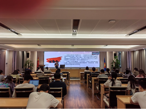 /中国-东盟金融合作学院党委委员、副院长潘莹在学院101教室给学院教工行政党支部、研究生2019级第一党支部和研究生2021级第二党支部的50余名党员上“对党忠诚,做合格党员”专题党课。