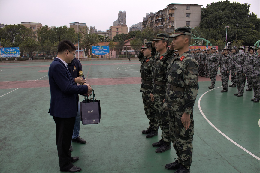最后学院领导老师们向军训教官和每位学员发放慰问品,并致以亲切的问候与关怀,勉励大家勇于磨练自我、超越自我,圆满完成军训任务!