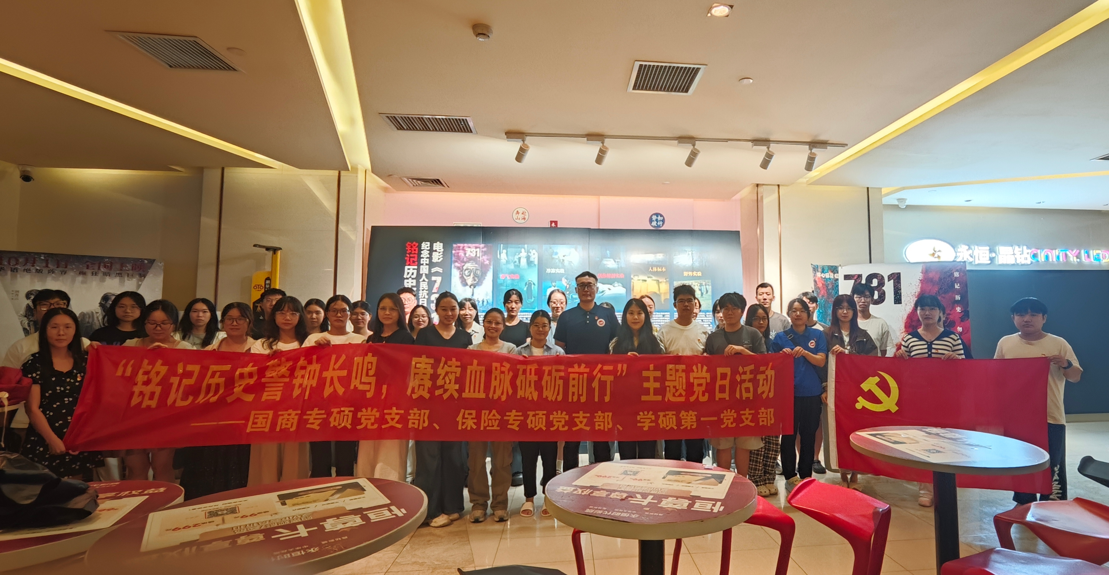 国商专硕党支部、保险专硕党支部与学硕第一党支部联合举办“铭记历史警钟长鸣,赓续血脉砥砺前行”红色观影主题党日活动,组织党员集体观看历史题材影片《731》,以影像为桥梁,回溯民族记忆,缅怀逝去同胞,凝聚前行力量。