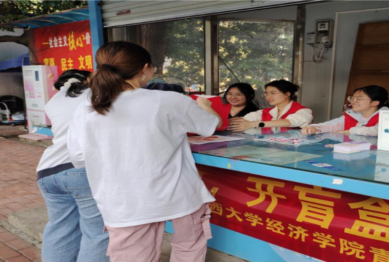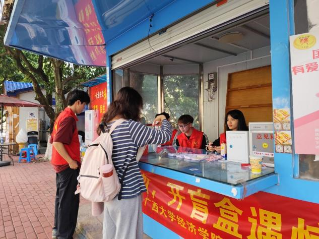 /中国—东盟金融合作学院青年志愿者协会在学生宿舍西八栋旁一站式学生社区服务点开展“学雷锋乐奉献,开盲盒遇惊喜”主题志愿服务活动,活动现场吸引了众多师生参与。