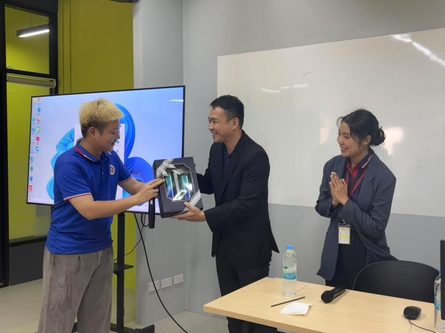 Kamonsak行长与陈经理耐心回应,进一步拓宽了大家对中国工商银行在泰运营策略与服务网络的理解。座谈会尾声,学生代表苏康佳向泰方代表致谢并赠送纪念品,双方合影留念,为中泰金融与教育交流再添一道温馨印记。