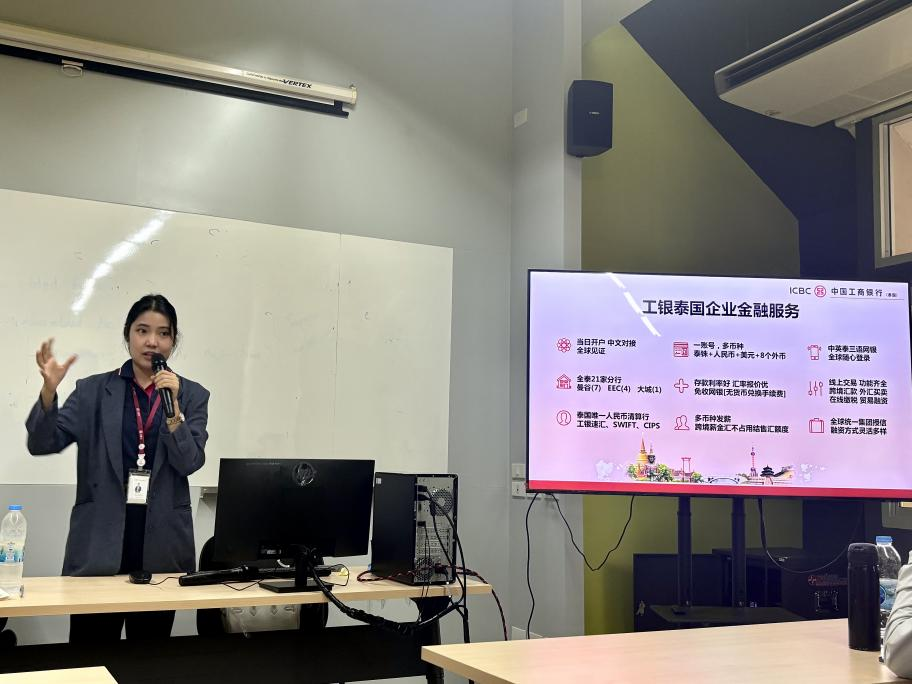 随后,访学团转赴清迈大学研究生院,参加中国工商银行(泰国)清迈分行专场座谈。分行行长Kamonsak Kaewkumfu及客户经理Suchanya Tanjarasjit(陈智美)共同出席。陈智美经理向师生全面介绍了工银泰国的业务布局与经营逻辑,尤其是在跨境融资、企业金融及个人业务方面的优势与创新。