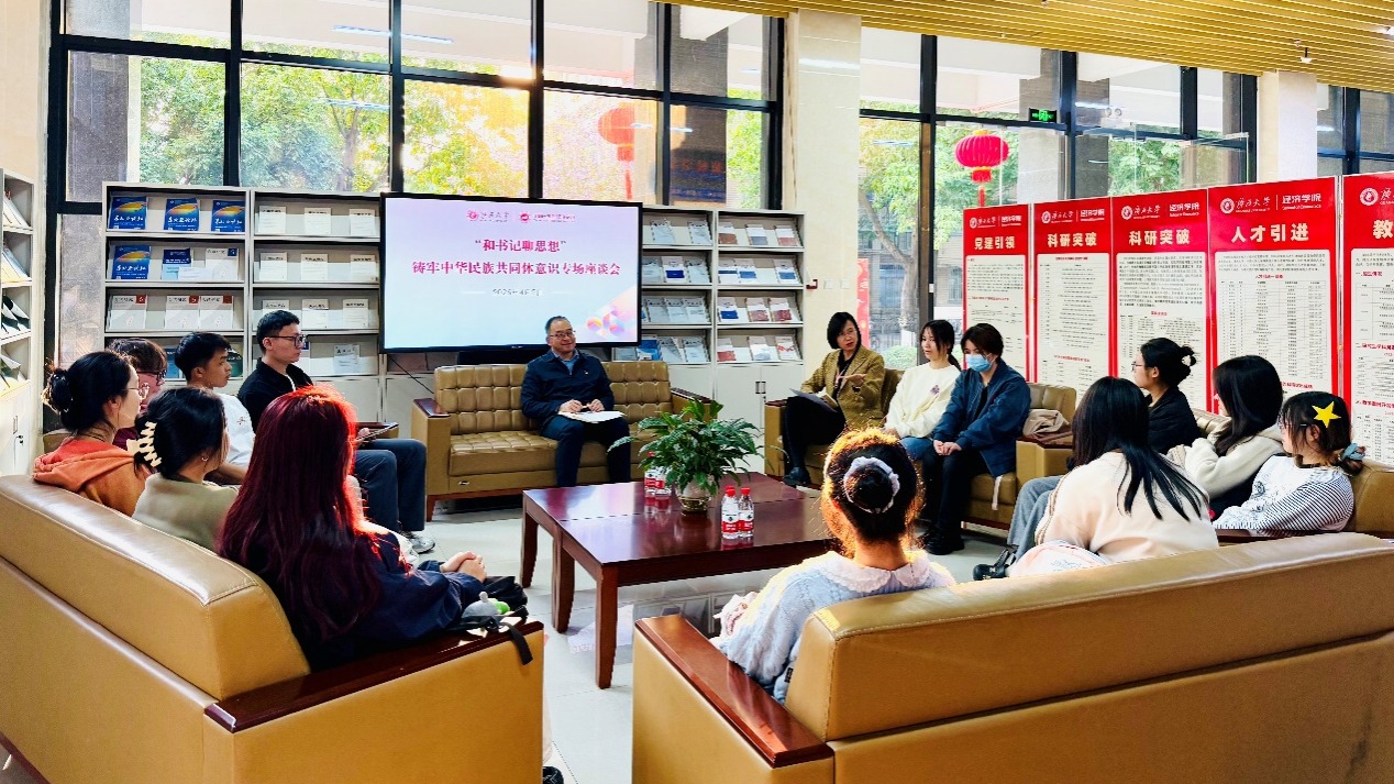 /中国—东盟金融合作学院党委在学院一楼大厅举办“和书记聊思想”——铸牢中华民族共同体意识专场座谈会。学院党委常务副书记罗诚与各民族学生代表一起共话民族团结情谊。学院团委书记王海希、辅导员郭霖刚参加座谈会。