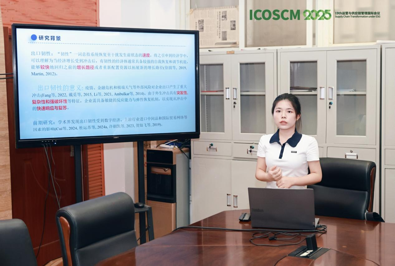 2023级应用经济学专业硕士研究生龚雪梅受邀参加会议并在分会场作题为“Supplier Digital Transformation and Enterprise Export Resilience(供应商数字化转型与企业出口韧性)”的学术报告,该报告基于出口增长速率的V形变化构建动态出口韧性指标,实证考察了供应商数字化转型对企业出口韧性的影响及其传导机制。