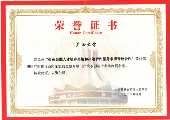 “打造金融人才培养高地和决策智库服务东盟开放合作”荣获第四届广西建设面向东盟的金融开放门户改革创新十大案例提名奖。