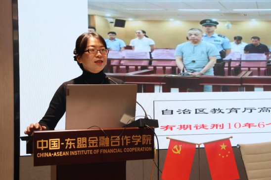 /中国-东盟金融合作学院党委副书记、纪委书记陈卉娟面向全体教职工开展“拒腐防变不松懈、酒驾醉驾要杜绝、这些饭局去不得”三方面内容的案例警示教育。