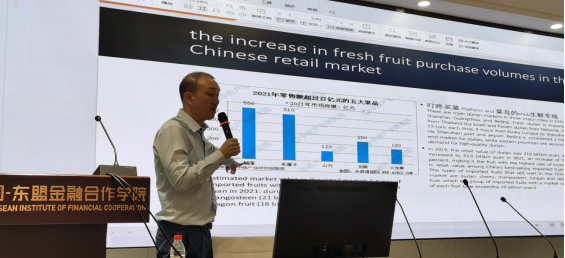 报告开始时,李雄英教授从“farm to table”发问,引出了中泰生鲜水果贸易研究的重要意义,然后详细分析了泰中水果贸易的数据。RECP实施后,作为泰国主要的水果消费市场,中国进一步提升了贸易便利化水平。为真正助力泰国中小企业水果出口到中国,李教授在实地调研的基础上,提出实现水果从泰国果园直达中国消费者餐桌的多种贸易方式及路径选择。