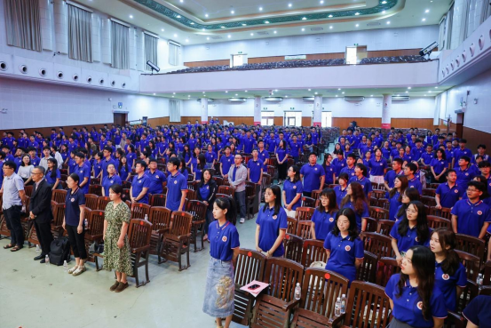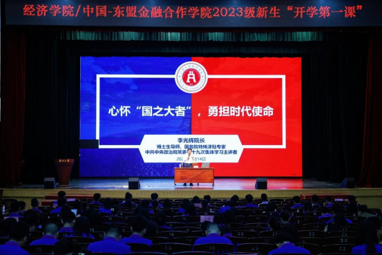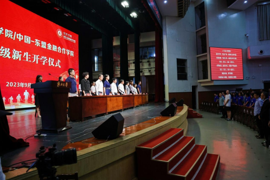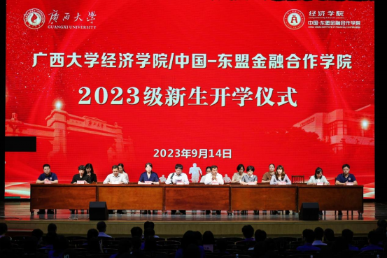 /中国-东盟金融合作学院2023级新生开学仪式在全场师生齐唱广西大学校歌中圆满结束。