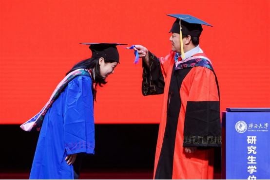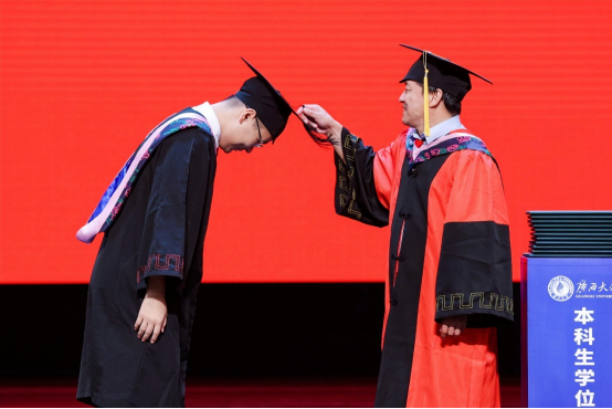 学位评定分委员会主席李光辉院长为2023届毕业生逐一拨穗、授予学位,学院学位评定分委员会各位委员在主席台上肃立见礼、与毕业生一一握手。