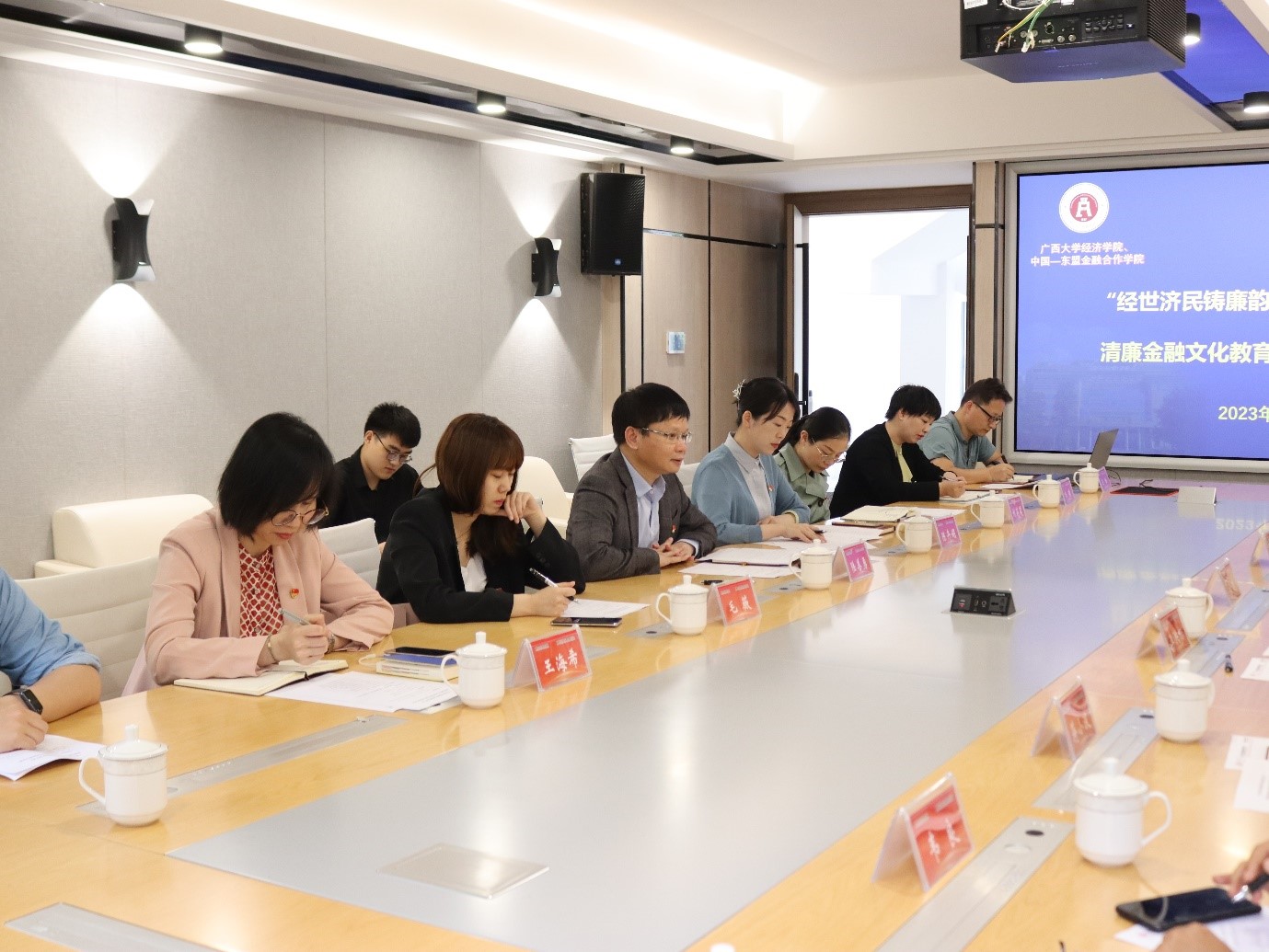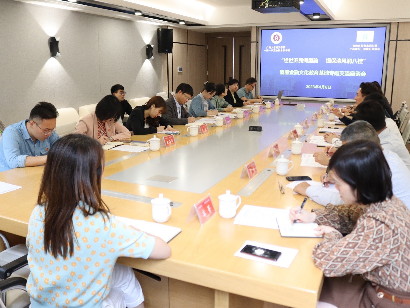 党委、纪委委员和师生代表与来宾在学院102会议室召开了主题为“经世济民铸廉韵 银保清风润八桂”的清廉金融文化教育基地专题交流座谈会。广西大学党委委员、学院党委书记陆善勇,学院党委副书记、纪委书记陈卉娟,院长助理、党政办公室主任杨璞,院长助理、纪委委员毛薇,团委书记王海希,纪委委员王峰,专职组织员刘莉莉,研究生党支部委员代表参加会议。