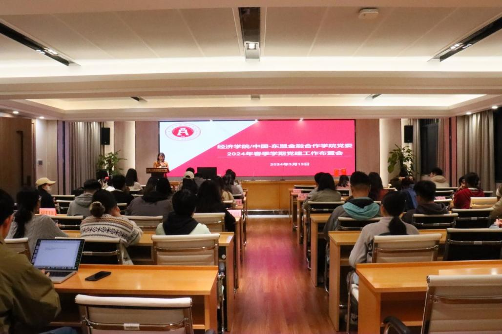 /中国-东盟金融合作学院在学院101教室召开2024年春季学期党建工作布置会。学院党委副书记、纪委书记陈卉娟,专职组织员王入仕,学院纪委委员、专职辅导员何湘桂出席会议,各学生党支部支委及党建工作秘书处相关人员参加会议。
