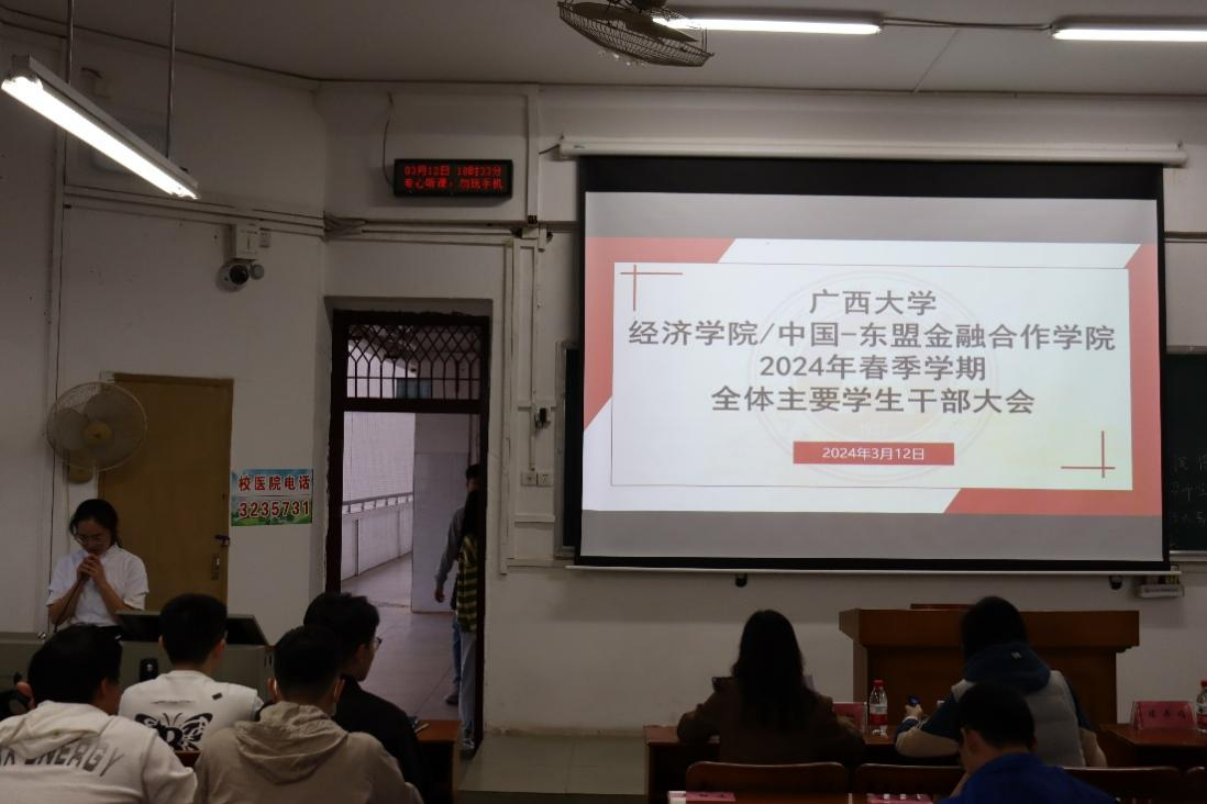 /中国-东盟金融合作学院2024年春季学期第一次主要学生干部大会在第二教学楼501教室召开。学院党委副书记陈卉娟,团委书记王海希,团委副书记何湘桂,辅导员覃晓阳、刘威及院级团学组织主要学生干部、各班班长和团支书参加本次会议。