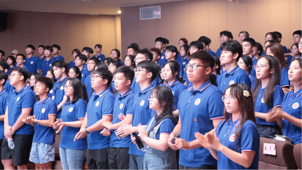 课堂上,为增强教学效果,罗诚还邀请了经济231班的唐咏荷同学和国贸231班的饶名扬同学现场领唱《没有共产党就没有新中国》和《歌唱祖国》,在昂扬激越的旋律中,全体新生重温了党的百年奋斗历程,感受到党的光辉伟大,将现场气氛推向高潮。
