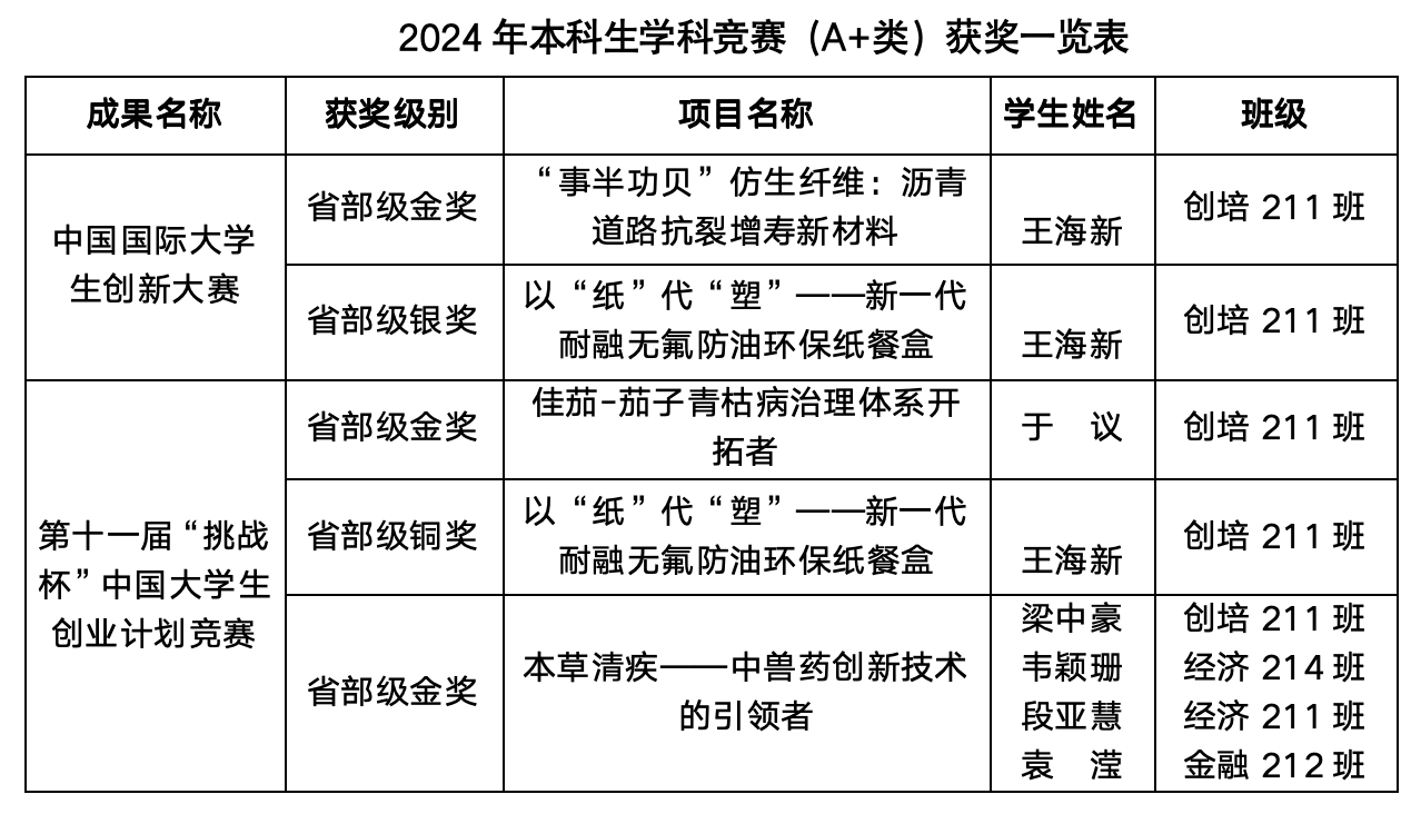本科生积极参加全国高校商业精英挑战赛国际贸易竞赛、全国高校商业精英挑战赛创新创业竞赛、“学创杯”全国大学生创业综合模拟大赛、全国企业竞争模拟大赛、全国高校经济决策虚仿实验大赛、iCAN大学生创新创业大赛、POCIB全国外贸从业能力大赛等各类竞赛,获国家级一等奖26人、二等奖25人、三等奖35人;参加中国国际大学生创新大赛、第十一届“挑战杯”中国大学生创业计划竞赛等A+类赛事,荣获省部级金奖6人,银奖 1人,铜奖1人。