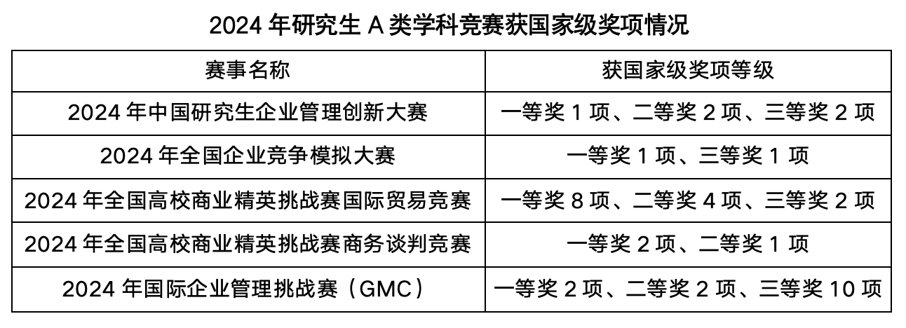研究生在中国研究生企业管理创新大赛、全国企业竞争模拟大赛、全国高校商业精英挑战赛国际贸易竞赛、全国高校商业精英挑战赛商务谈判竞赛等国家级学科竞赛中获全国奖38项。