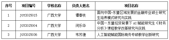 谭春枝、闭乐华、韦苏倢三位教师分别担任课题负责人的项目,成功获批2025年广西学位与研究生教育改革课题立项,详情见下表。