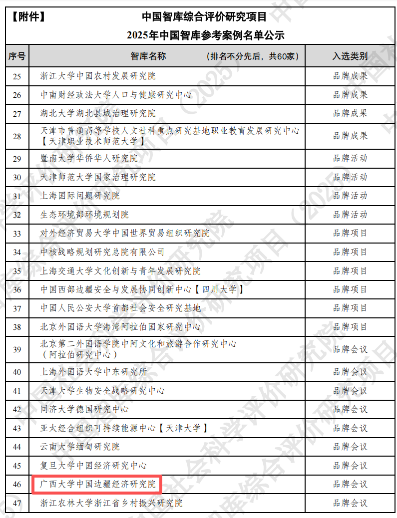 2025年8月21日,中国社会科学评价研究院公示了中国智库综合评价研究项目(2025)中国智库特色案例名单和中国智库参考案例名单。广西大学中国边疆经济研究院成功入选中国智库参考案例名单,是广西大学乃至广西壮族自治区中唯一一家入选品牌会议的研究机构,更是国内唯一一家以“边疆经济”为主题办会而入选的会议,标志着其在边疆经济领域的特色化、影响力、管理力获得国家级评价权威机构认可。