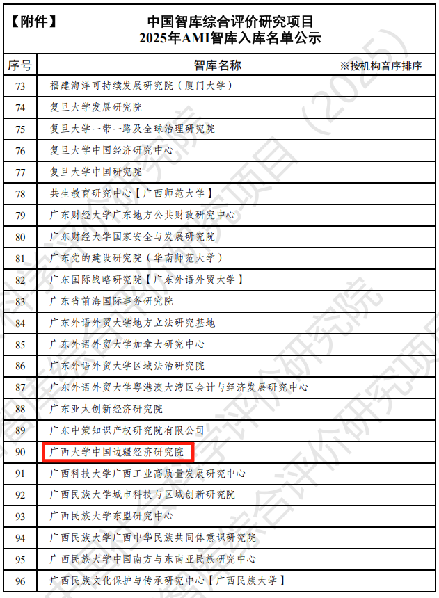 2025年7月,中国边疆经济研究院入选2025年AMI智库;2025年8月,中国边疆经济研究院品牌年度论坛“中国边疆经济开放发展论坛”入选2025年中国智库参考案例,全面展现了边疆院在科研创新与会议组织上的综合实力,这既是广西大学深入实施中国特色新型高校智库建设、推动高校智力服务能力整体提升的重要成果,也是国家级权威评价机构对边疆院长期深耕边疆经济研究、服务国家战略需求、助力边疆地区高水平对外开放和高质量发展的高度肯定。