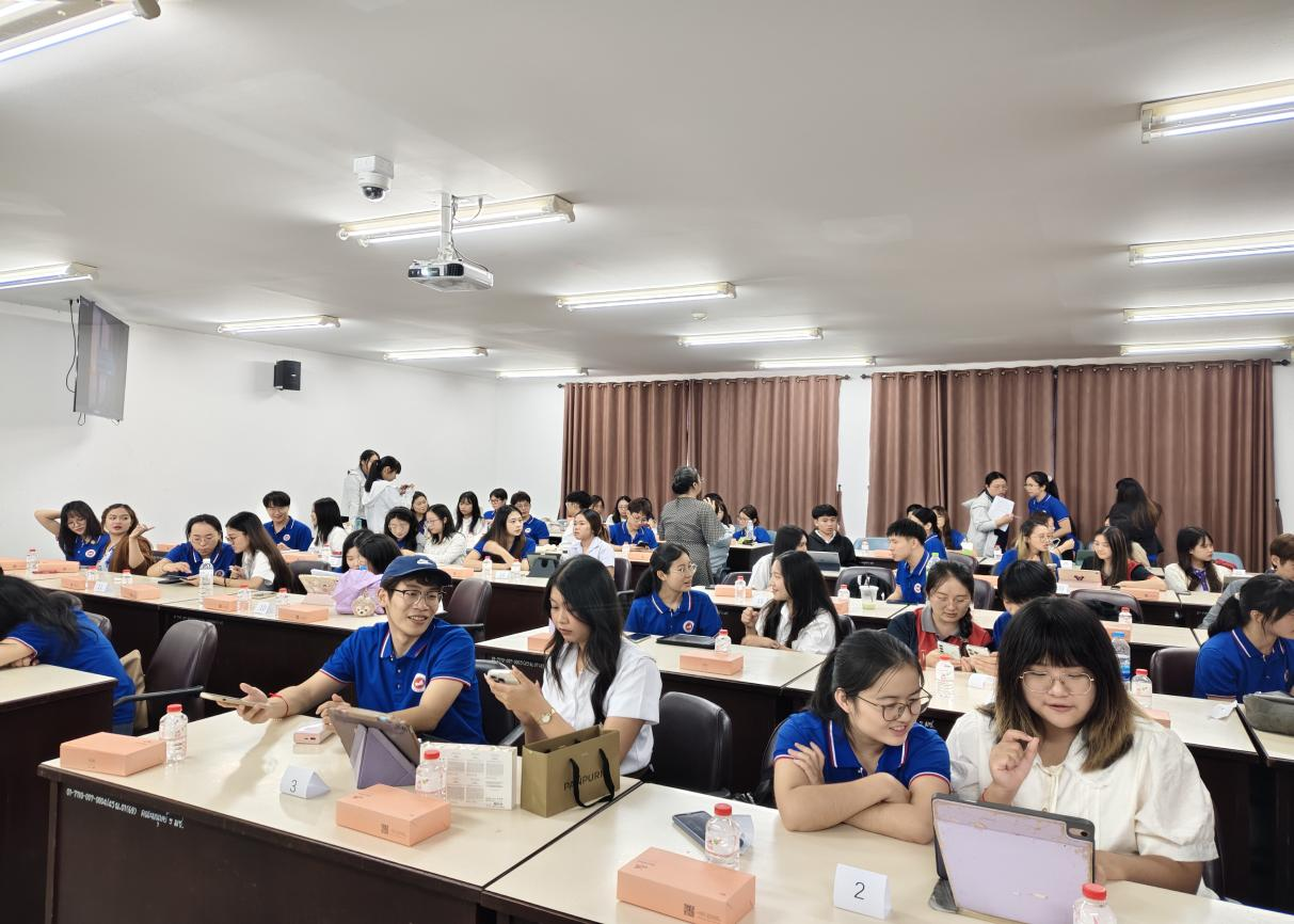 广西大学的同组学生结合中国市场消费习惯,与泰方展开热烈讨论。中泰学生不时低头查阅资料,时而以中英双语交流,笑声不断。泰方学生李冬冬兴奋地说:“非常感谢中国学生的帮助,他们提出的设计想法太棒了!”广西大学国际商务专硕的陈莉莉则表示:“与泰国朋友一起讨论本土特色产品,让我更清楚地理解泰国的消费文化,也收获了许多真诚的伙伴。”