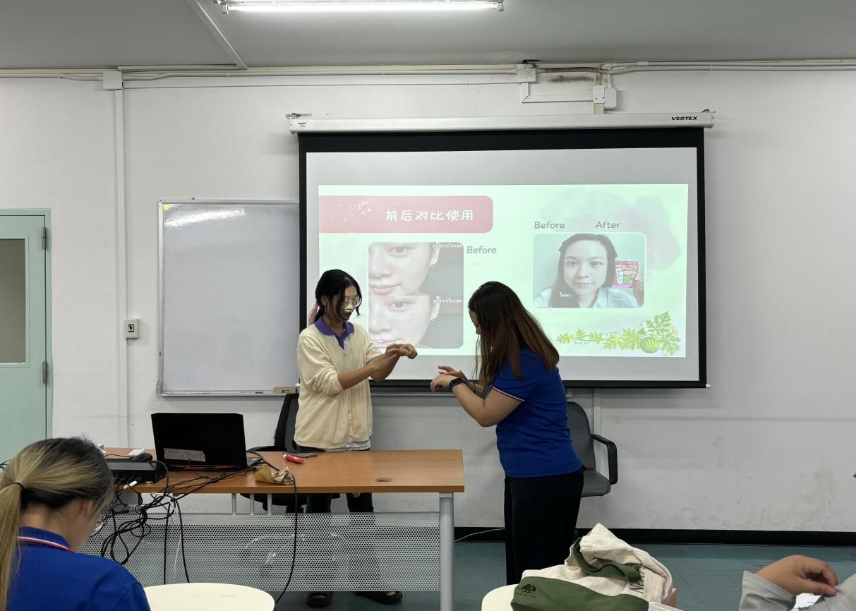 作为交流会的核心环节,清迈大学中文系的学生精心筹备并展示了一系列具有地域特色的本土产品,涵盖草本护手霜、蛇牌爽身粉、薄荷鼻通手工香皂,以及多款充满地域风味的特色小吃与零食。展品不仅体现了泰国传统工艺与现代创新的结合,也展示了泰国本土品牌在健康、日用品与休闲食品领域的多元化发展。学生们逐一向交流访学团的师生介绍制作工艺、原材料来源与使用场景,并就文化背景、市场定位与潜在合作机会展开深入交流,现场氛围热烈、跨文化对话生动活泼。