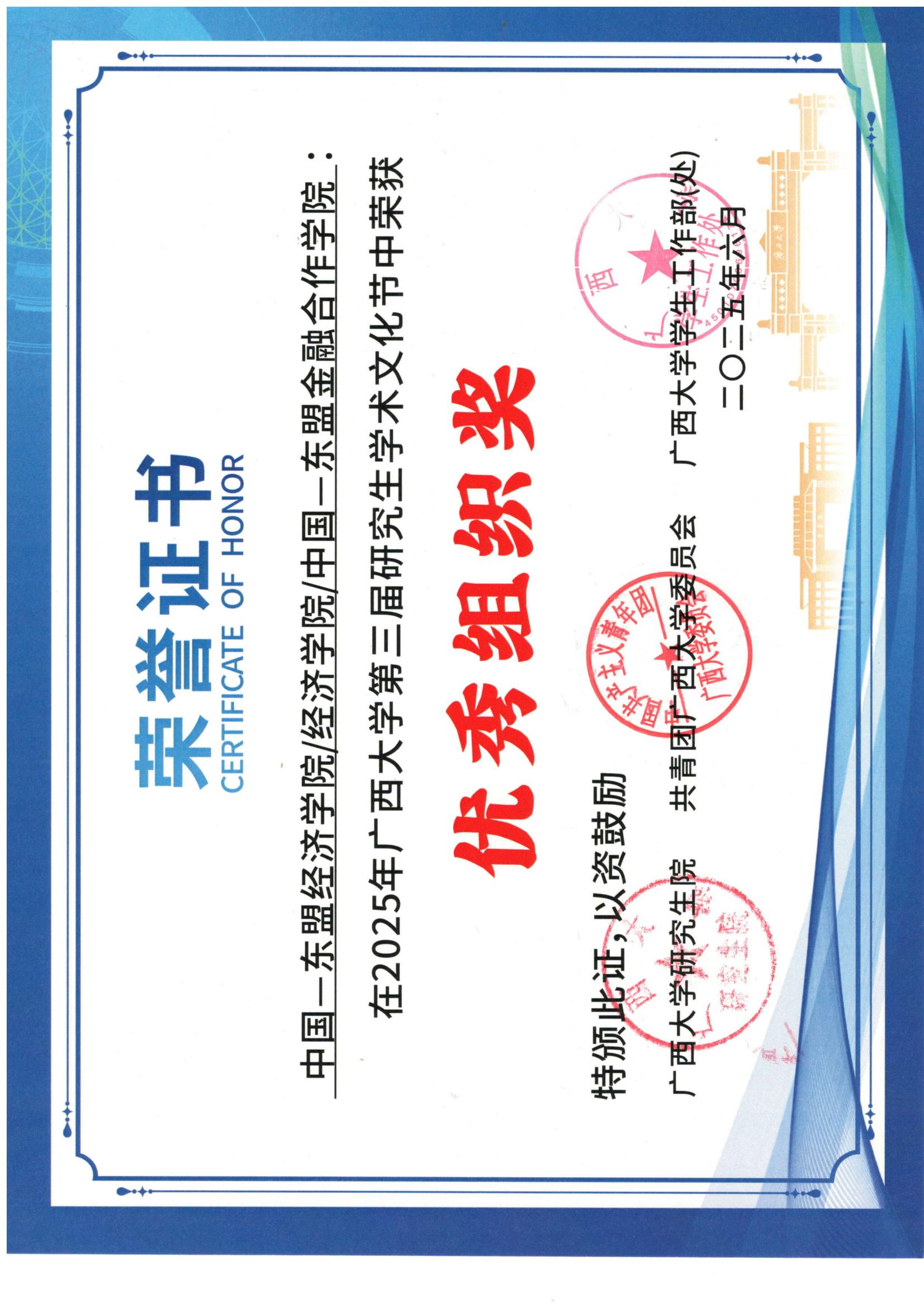 获广西大学第三届研究生学术文化节优秀组织奖