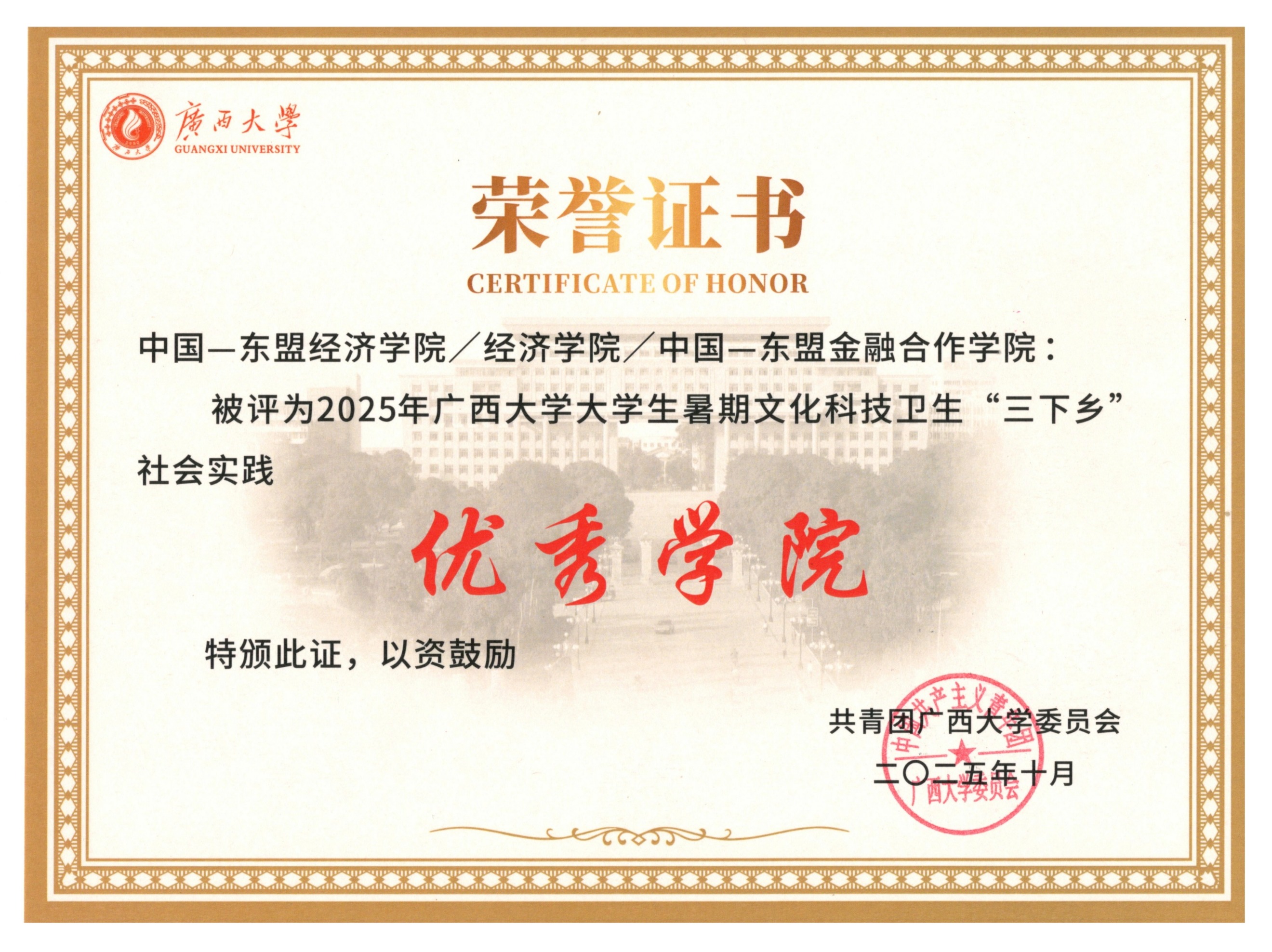 获评广西大学大学生暑期文化科技卫生“三下乡”社会实践优秀学院