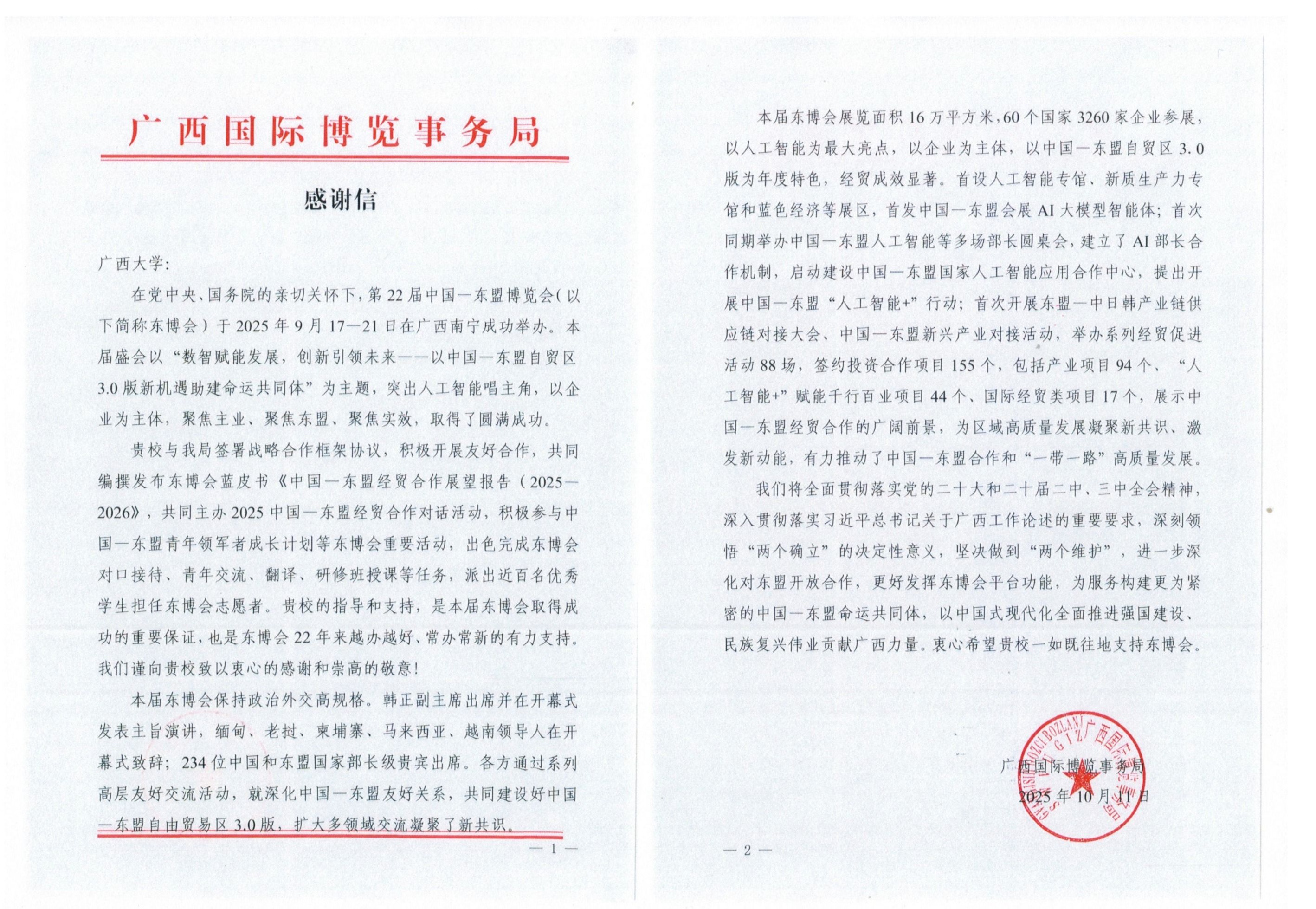 收到广西国际博览事务局发来感谢信