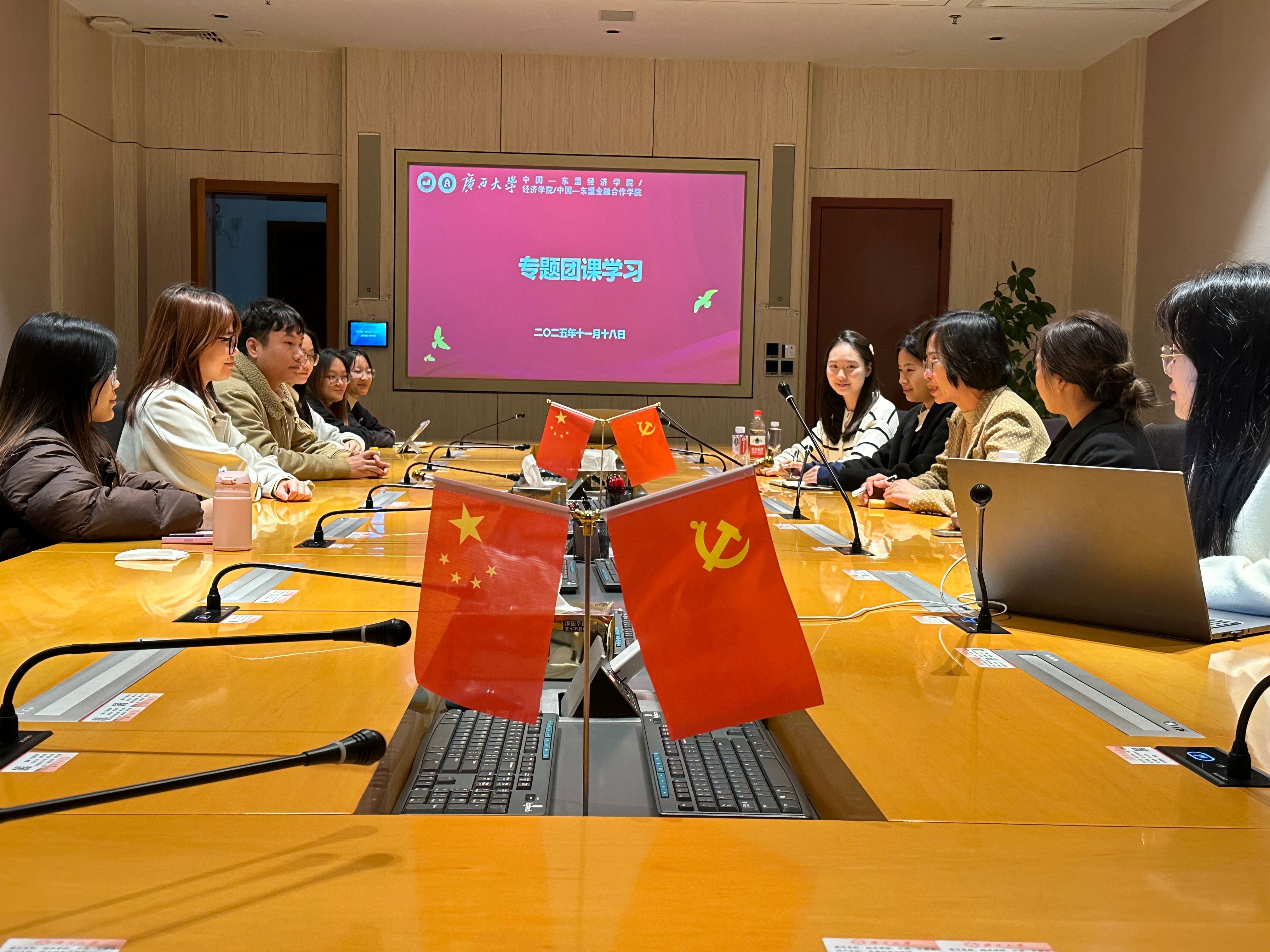 本院共青团工作始终坚持党的领导,牢牢把握政治方向。过去五年,校内外单位各级领导多次莅临指导,出席学院成立仪式和挂牌仪式、第22届中国—东盟博览会“2025年中国—东盟经贸合作对话活动”、“五四”青年表彰等重大活动并发表讲话,为青年成长把舵定向。上级专题听取工作汇报,对实践基地建设、青年人才培养、校友资源整合等领域作出具体指示;建立常态化的“师生面对面”交流机制,通过“和书记聊思想”和学生骨干培训等形式,积极回应青年成长成才的核心关切。这些精准的指引与深切的关怀,为本院团学工作注入了强大的发展动力,引领青年在推进中国式现代化、服务中国—东盟命运共同体和新时代壮美广西建设中挺膺担当。