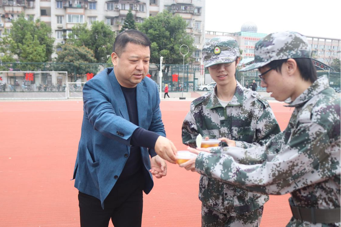 随后,学院领导与老师们走进方阵,将一碗碗满载情谊的汤圆递到学生手中。他们一边分发慰问品,一边与同学们亲切交流,细致了解训练进展和日常生活。笑容温暖,问候真切,热汤圆腾起的蒸汽裹挟着关怀,驱散了冬日的寒意,也浸润了每一位学子的心田。