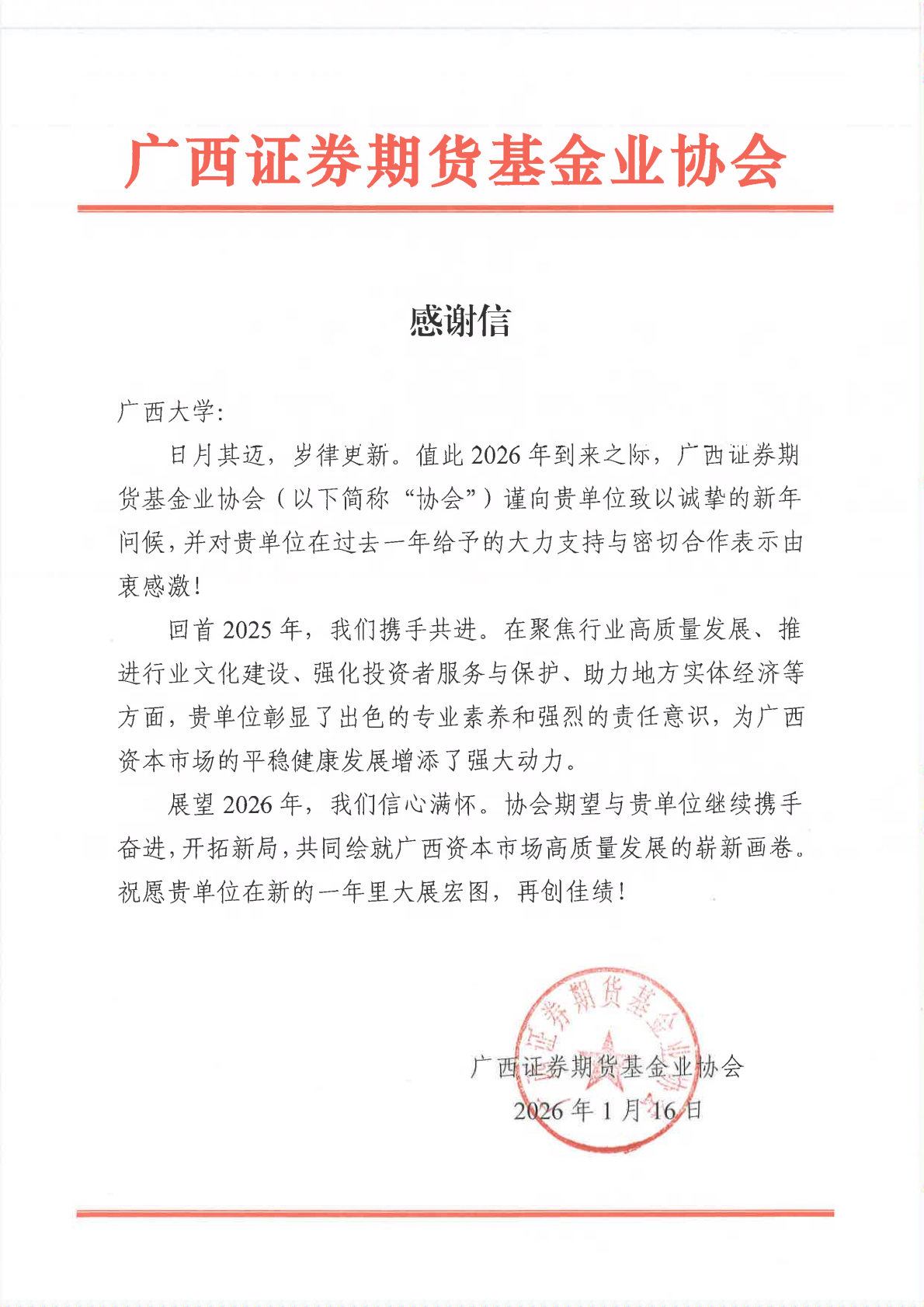 /中国—东盟金融合作学院收到广西证券期货基金业协会发来的感谢信,对学校及大发快三平台