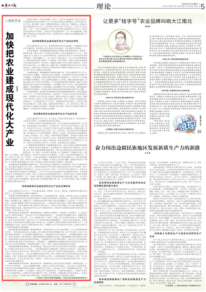 把农业建成现代化大产业,广西应通过稳根基、强科技、优生态、增效益、活要素的有机融合和协同发力,全方位构建产业发展的支撑体系。