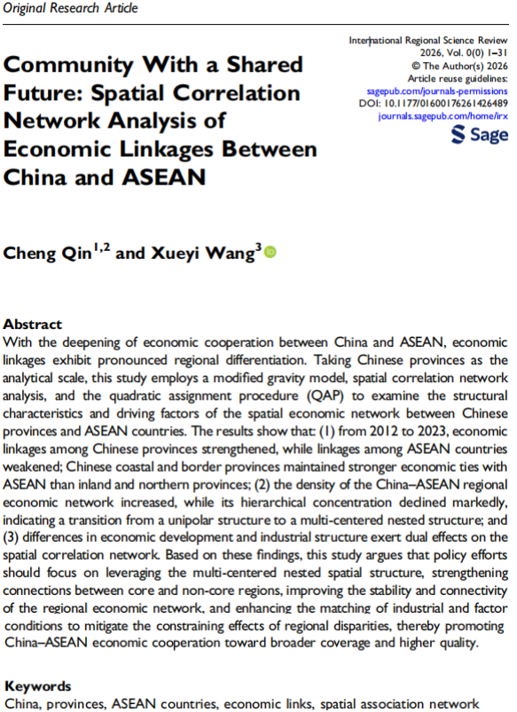 教师覃诚作为第一作者与其合作者共同完成的学术论文“Community with a Shared Future: Spatial Correlation Network Analysis of Economic Linkages between China and ASEAN”(《命运共同体:中国—东盟经济联系的空间关联网络分析》)在《International Regional Science Review》发表。该研究得到广西高校人文社会科学重点研究基地中国—东盟区域发展协同创新中心基金项目、大发快三平台