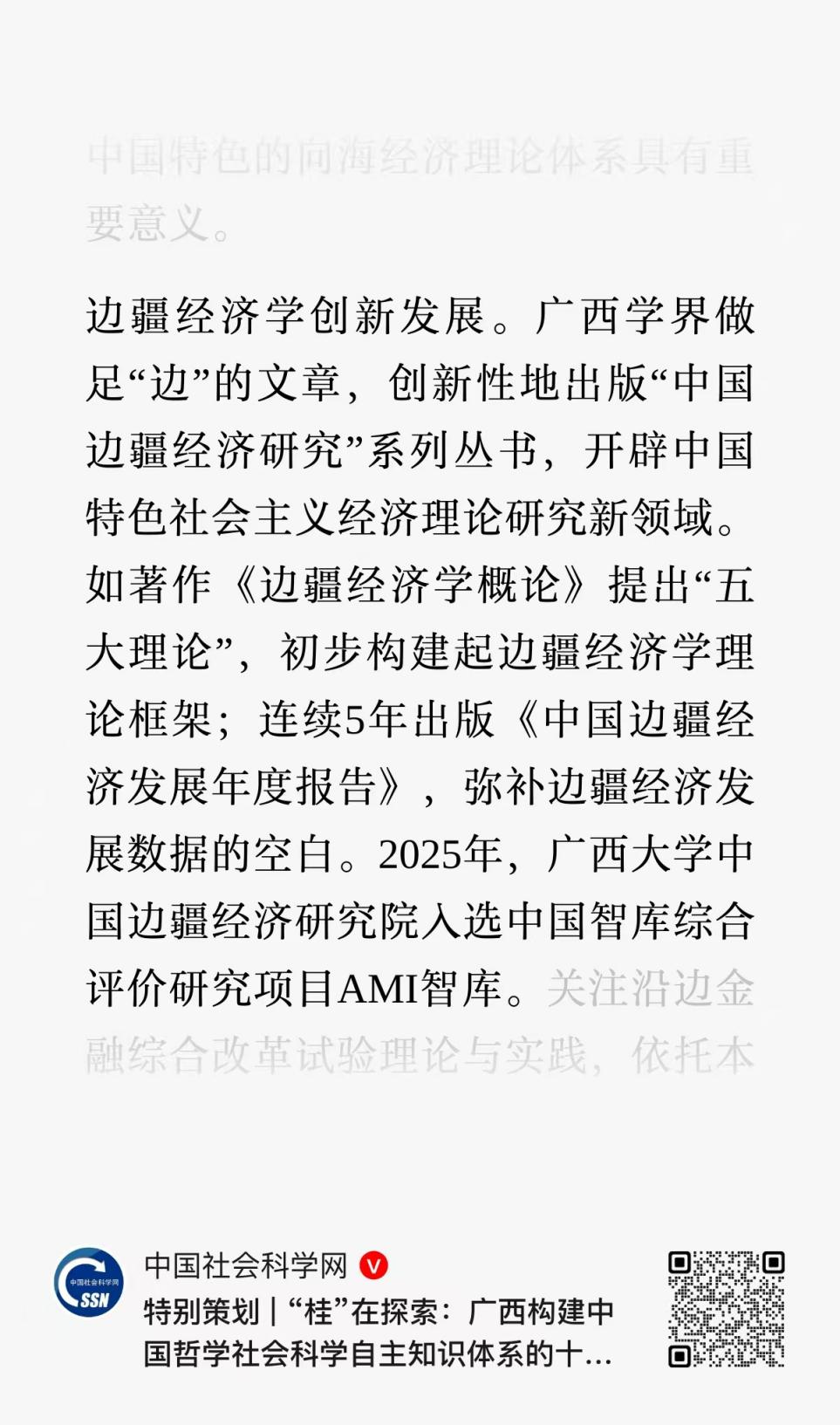 近日,《中国社会科学报》及中国社会科学网发布《特别策划 | “桂”在探索:广西构建中国哲学社会科学自主知识体系的十年历程与展望》长篇报道,系统梳理2016—2026年十年来广西哲学社会科学领域的重要成就。报道在“区域经济学:沿边开放理论创新”板块中,以专门段落介绍广西边疆经济学研究进展,并明确指出2025年广西大学中国边疆经济研究院入选中国智库综合评价研究项目AMI智库。