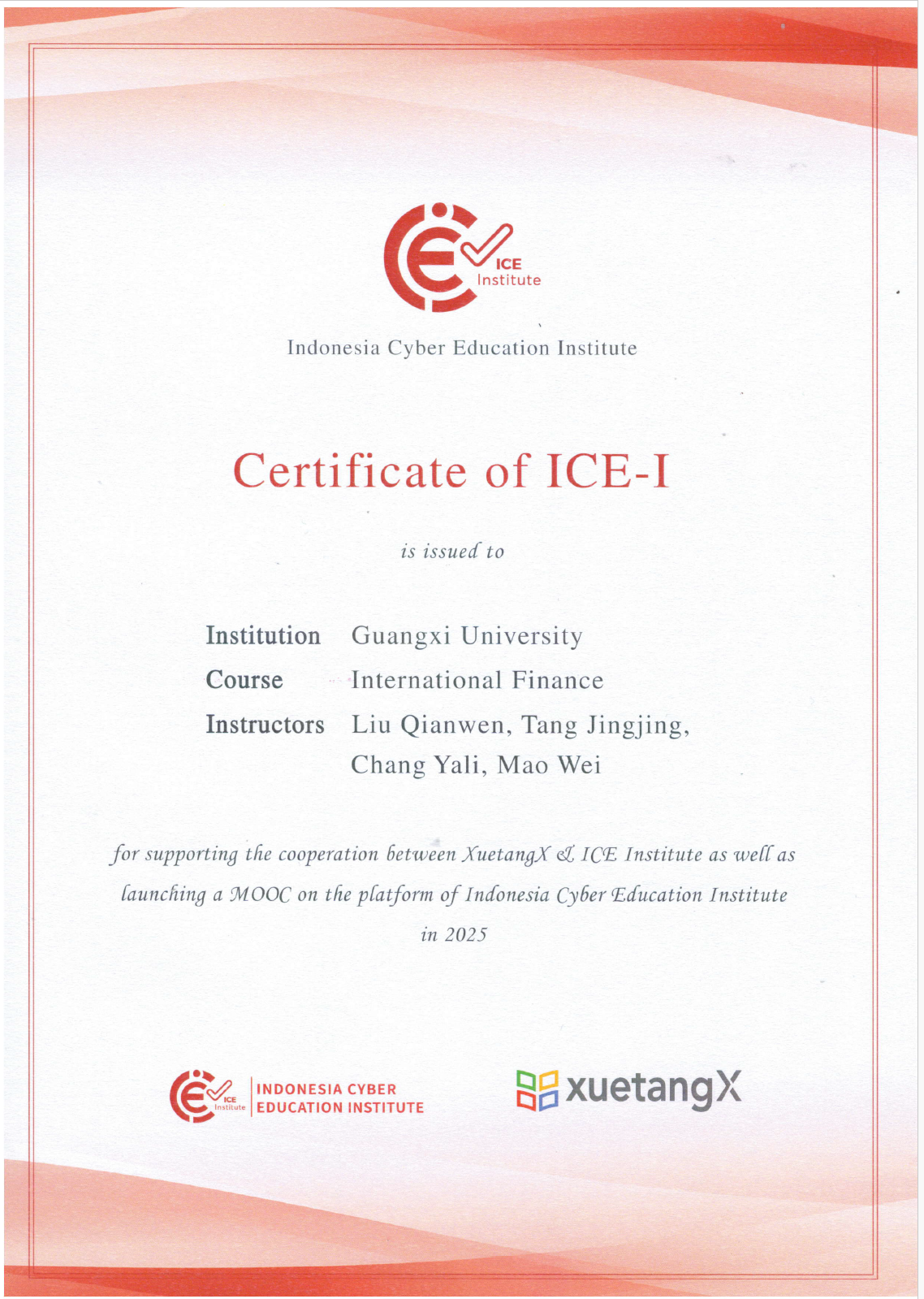 学院国际化办学日前取得新进展。刘骞文老师团队的全英文课程 《国际金融(International Finance)》 成功上线印尼国家慕课平台(ICE Institute),面向印尼及东盟各国学习者开放,这标志着学院在课程国际化方面实现了新的突破,有助于提升学院的国际影响力,深化与东盟国家高校的交流合作,为学院建设中国—东盟区域国际化人才培养基地进一步夯实了基础。
