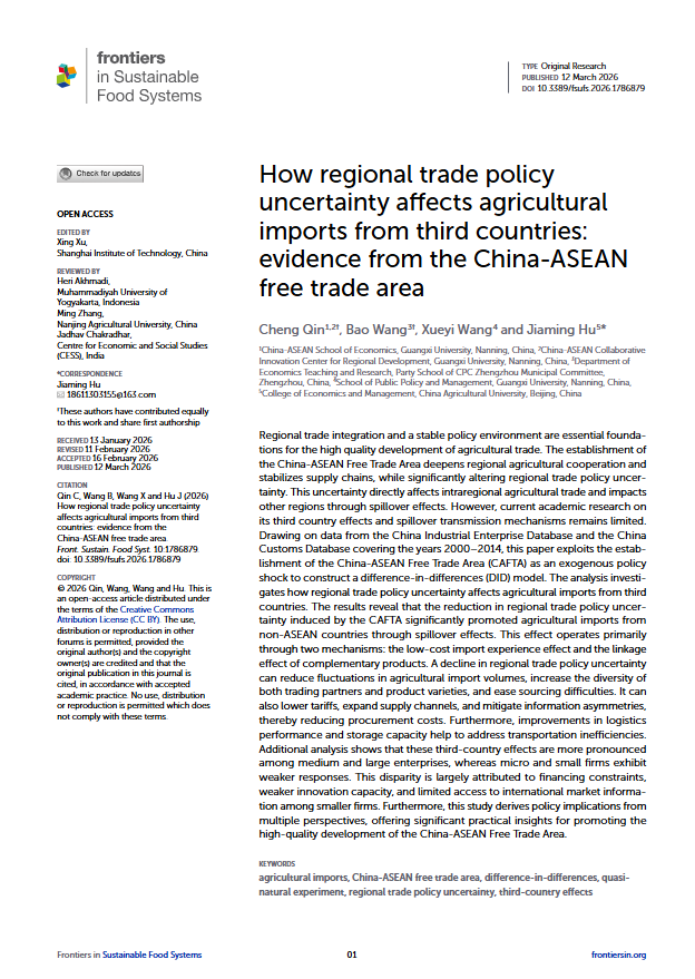 教师覃诚作为共同第一作者,与合作者共同完成的学术论文 “How regional trade policy uncertainty affects agricultural imports from third countries: evidence from the China-ASEAN free trade area”(《区域贸易政策不确定性如何影响自第三方国家的农产品进口——来自中国-东盟自由贸易区的经验证据》)在《Frontiers in Sustainable Food Systems》正式发表。该研究得到广西高校人文社会科学重点研究基地中国—东盟区域发展协同创新中心基金项目(CWYB202405)、大发快三平台